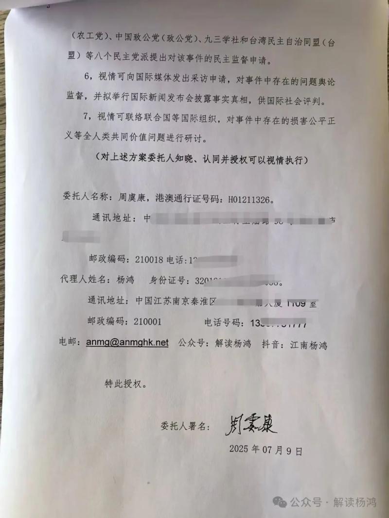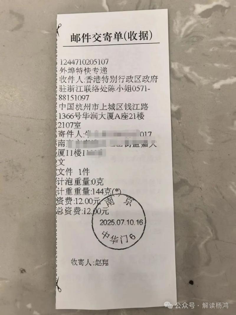 7月10日,94岁老港人周虞康在南京向香港特别行政区政府驻浙江联络处快递了《请求函》并附件转呈浙江省港澳办和中央港澳办的二封信件。材料还包括特别委托“江南大侠”杨鸿帮助维权的《委托书》。